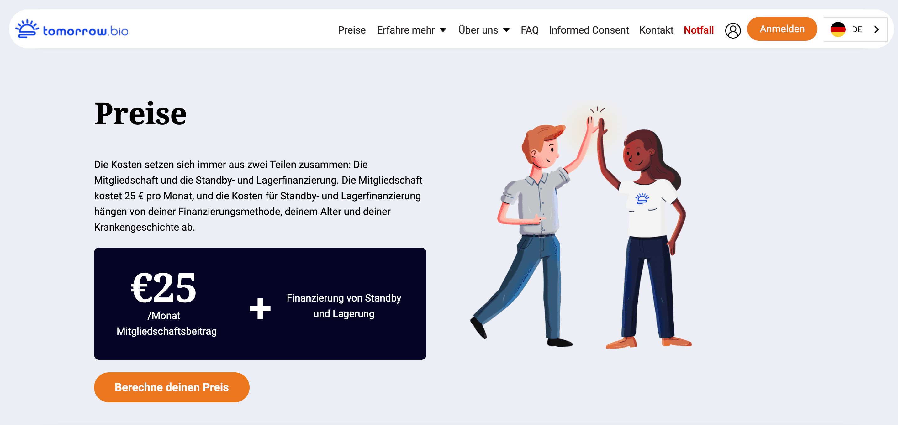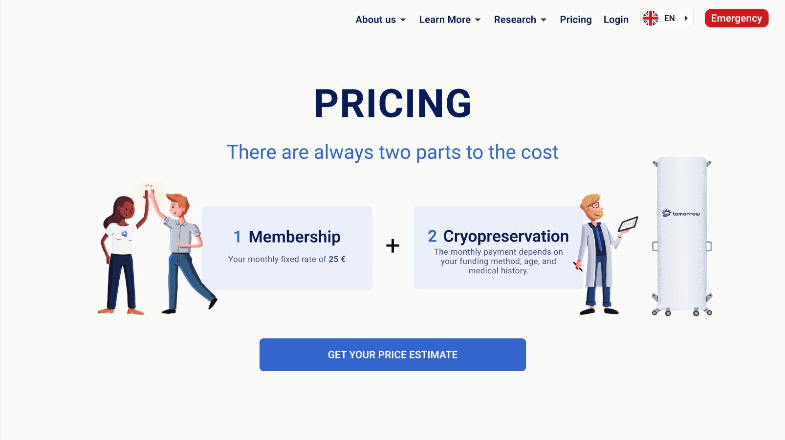 Tomorrow Biostasis members sign up to be cryopreserved after their legal death by paying a 25 EUR monthly membership fee and the fee for a life insurance policy.